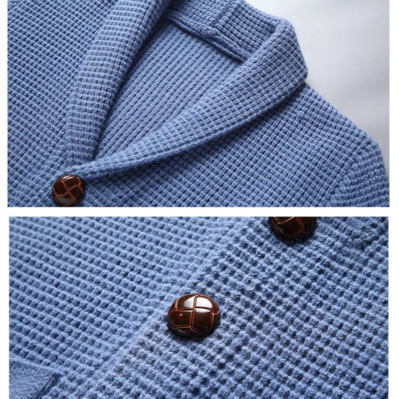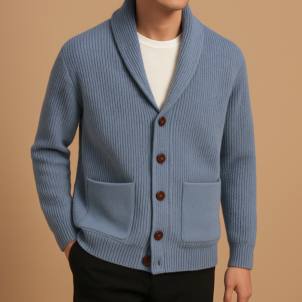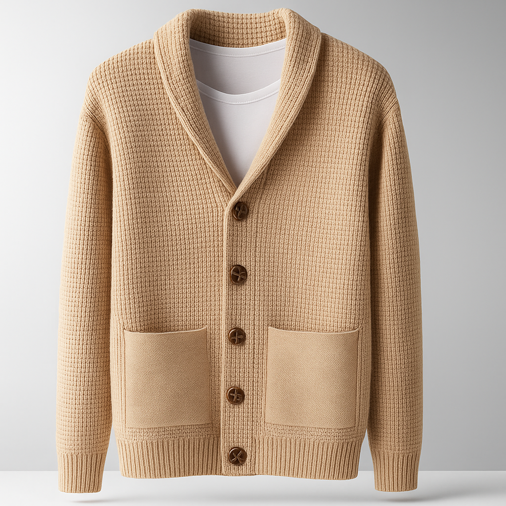Built for the man who wants comfort without compromise, this shawl‑lapel cardigan is knit from naturally breathable, temperature‑regulating wool in a structured waffle rib that delivers warmth without weight and layers cleanly over a tee or collared shirt.