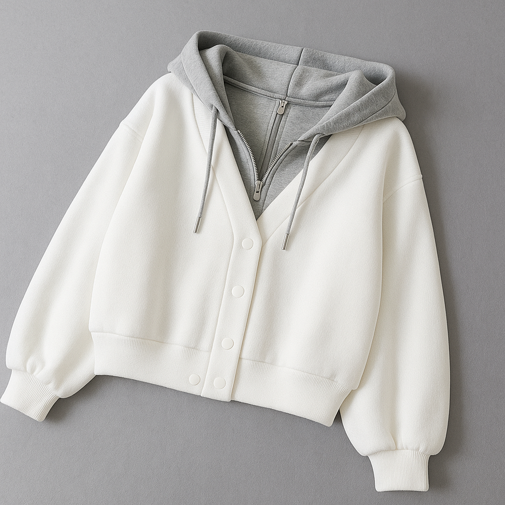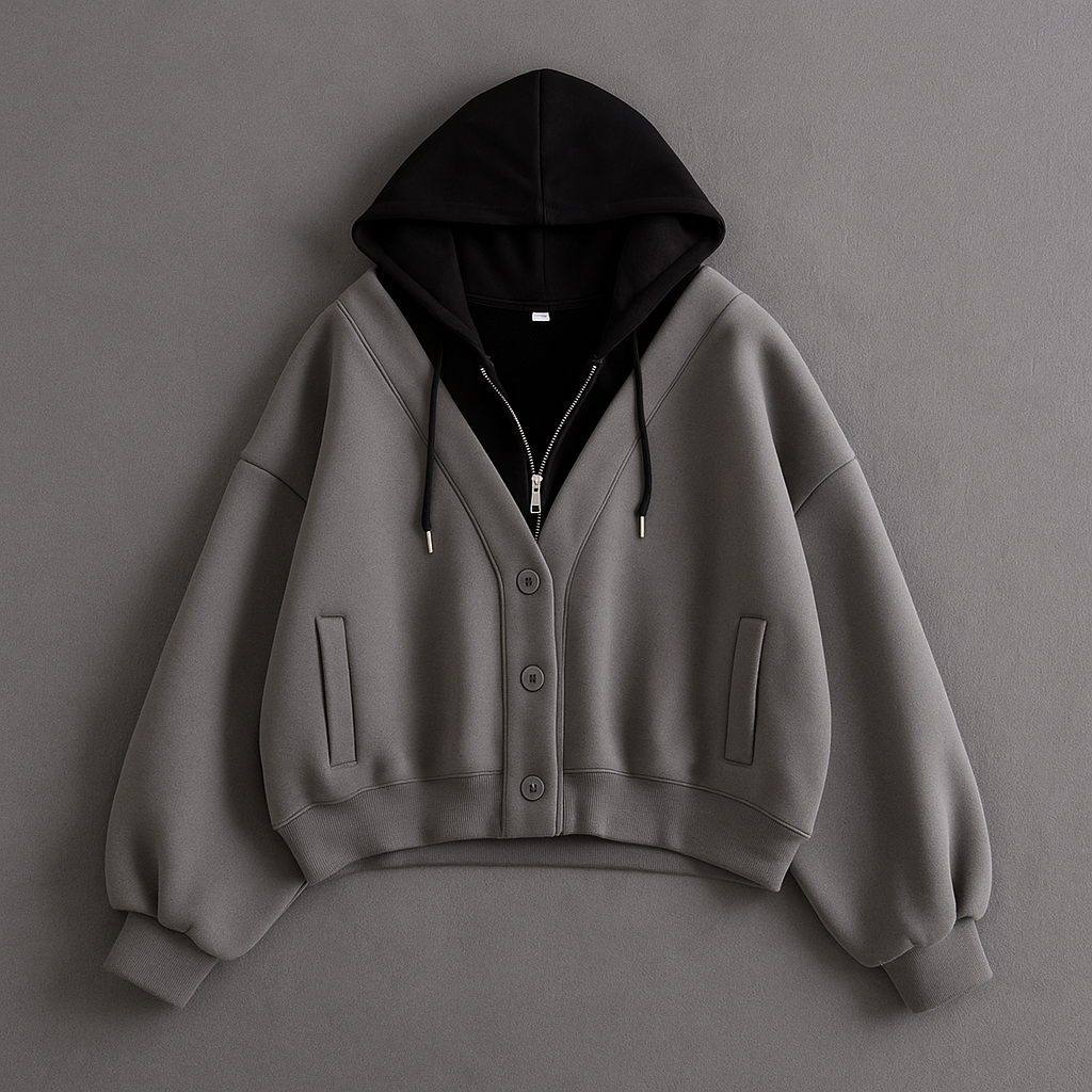 Slay your style game with this cardigan-hoodie fusion of chic comfort that will have all others looking on in disbelief to how comfy can look so good. Our ultra soft cropped college hoodie, reimagined with a knit-cardigan outer and puffy loose lantern sleeves for all the warmth and coziness you crave.