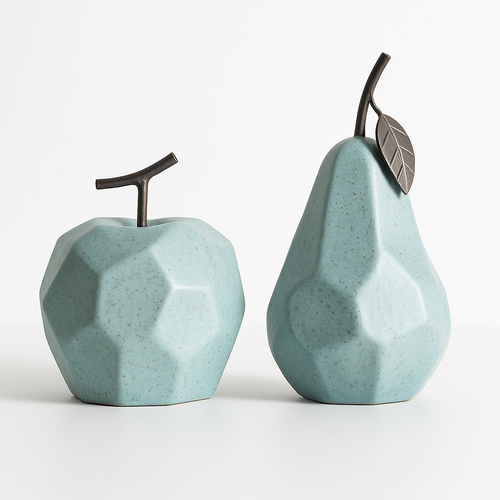 Add a refined touch of Nordic inspired artistry to your space with these minimalist geometric ceramic fruit sculptures. Crafted from high-quality ceramic and finished with a smooth enamel glaze, each piece reimagines the natural form of fruit through a modern faceted design. The soft pastel tones bring a sense of calm minimalism, making them the perfect statement accents for your home.