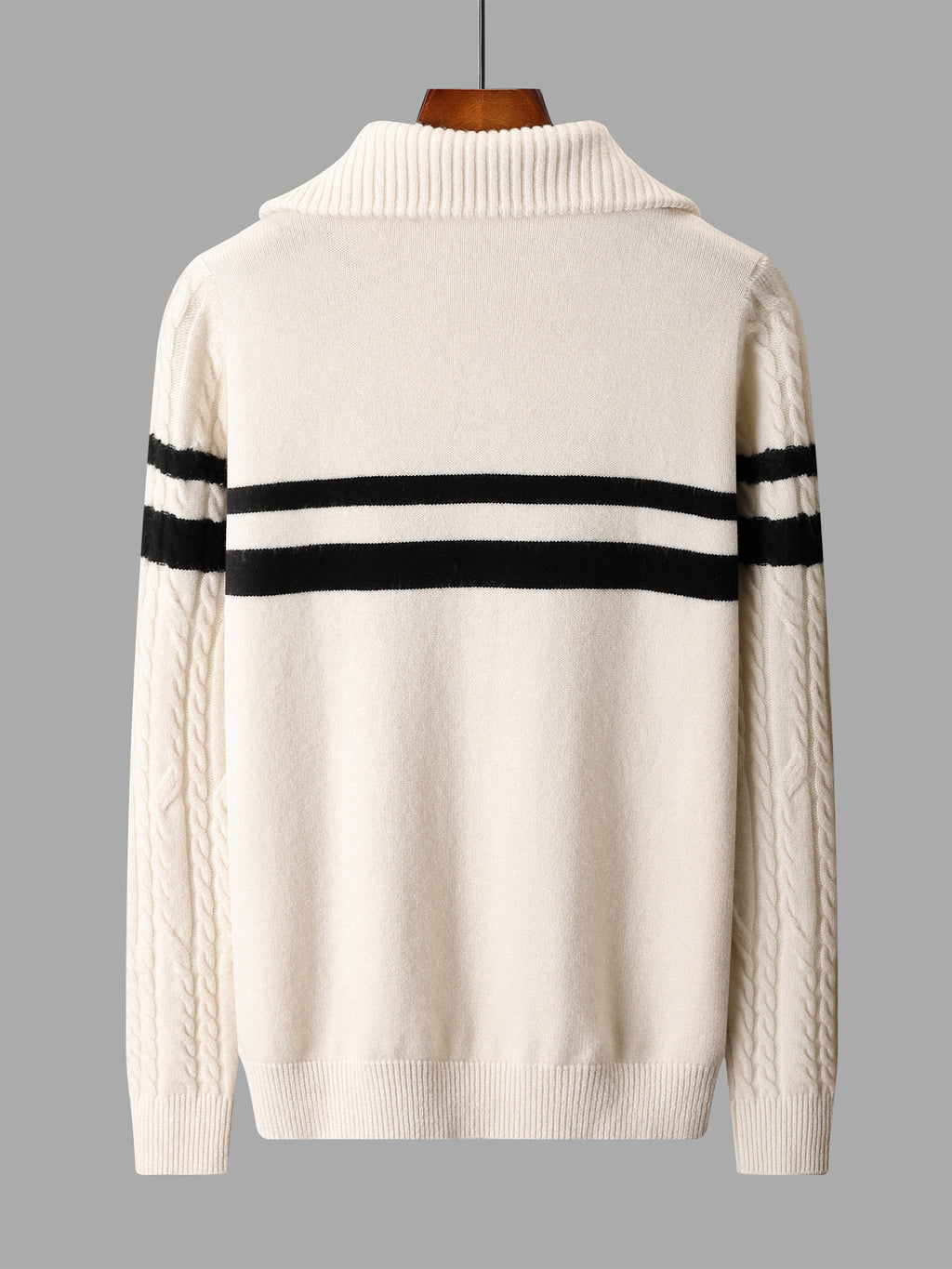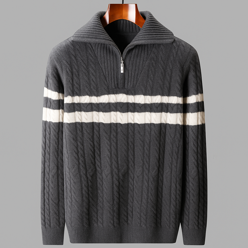 Made from 100% premium wool, this thick quarter-zip sweater redefines everyday knitwear. With a fold-over collar, contrast varsity stripe, and cable-knit texture, it combines a sporty undertone with luxurious warmth and lasting comfort.