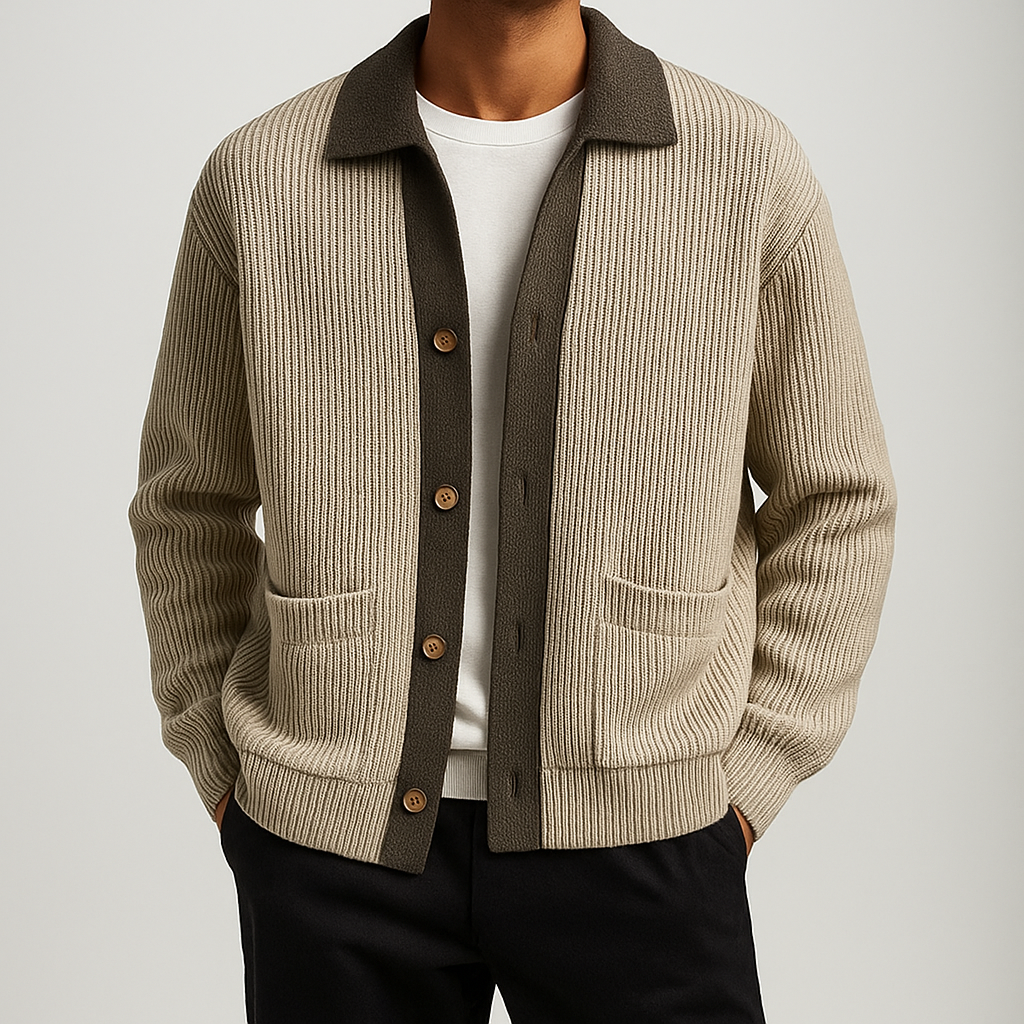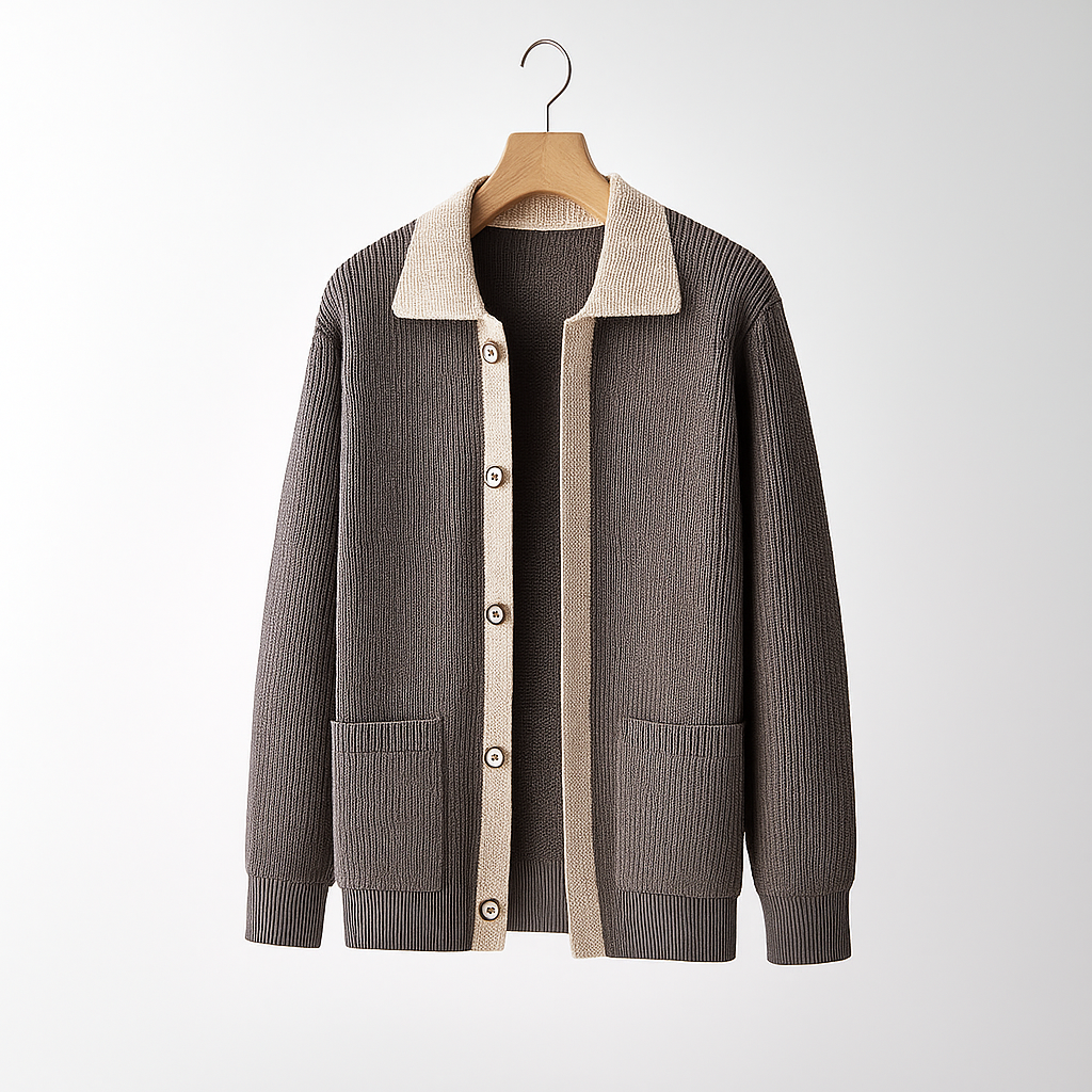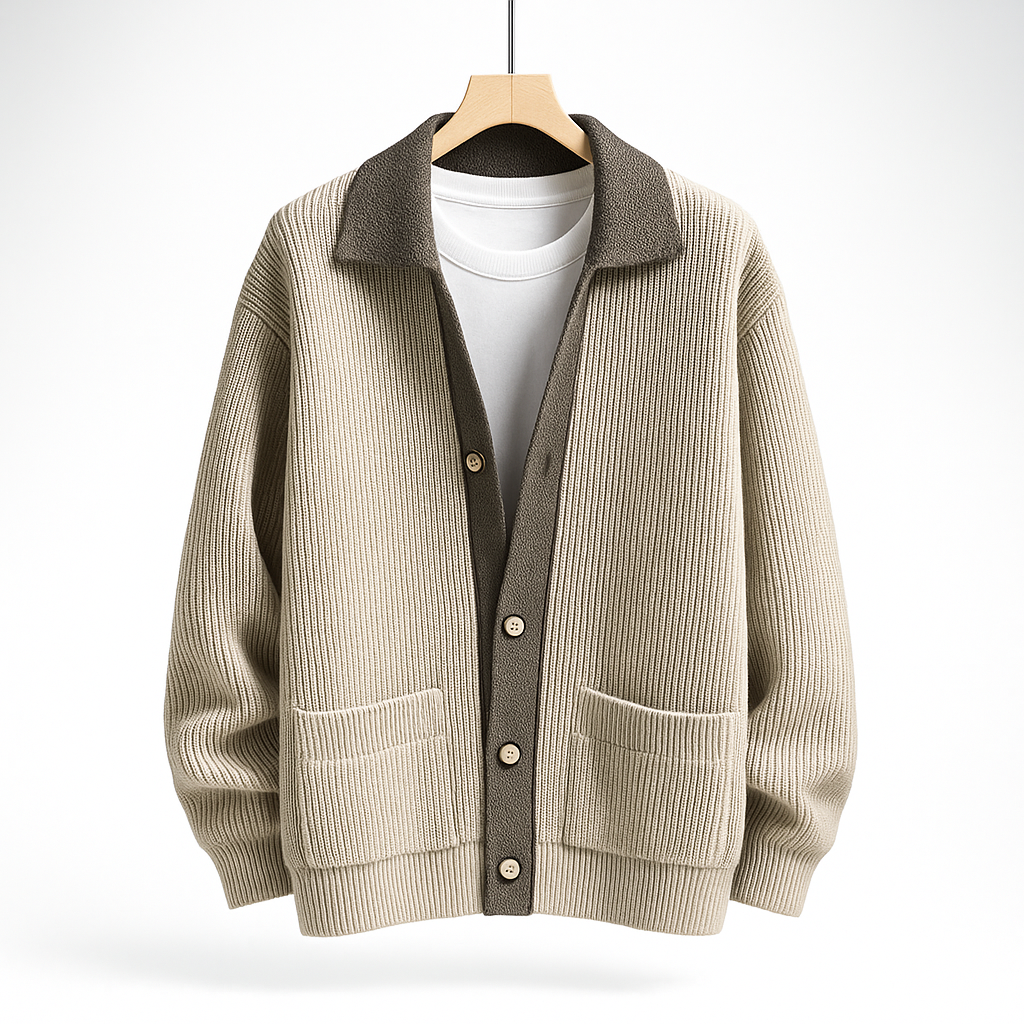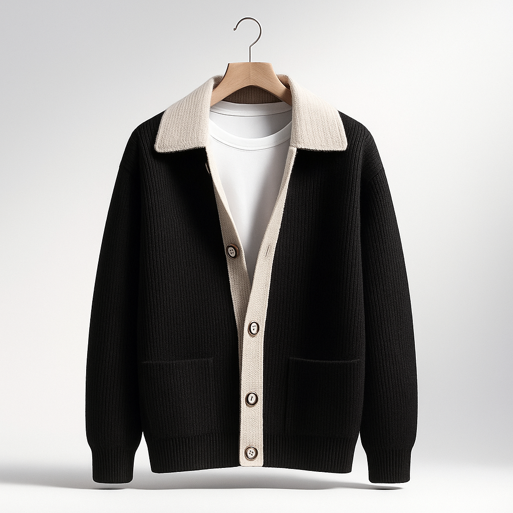 Crafted from a thick, warm knit, this cardigan features a contrast button placket and a wide shawl collar for a refined yet relaxed aesthetic. A seamless blend of laid-back sophistication and modern craftsmanship, perfect for layering through the cooler seasons.