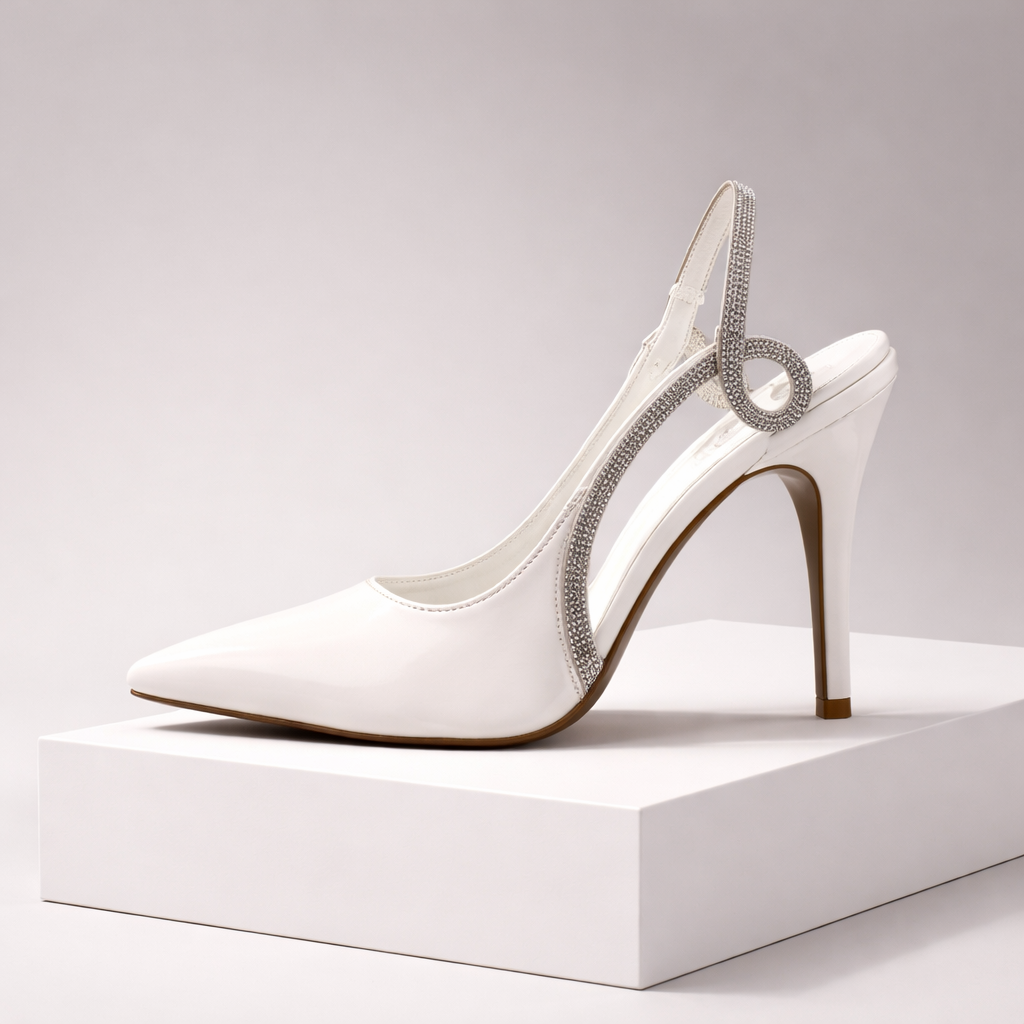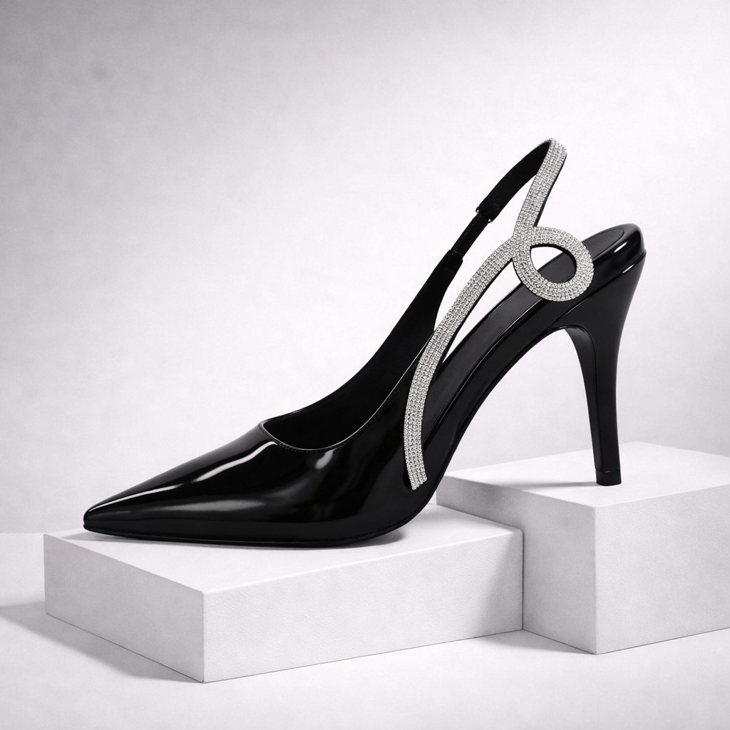 Our bold high-gloss patent upper is anchored by a statement crystal sling that pulls focus instantly. A secure slingback fit and sleek stiletto keep your silhouette polished, supporting confident strides from dinner to late-night plans.