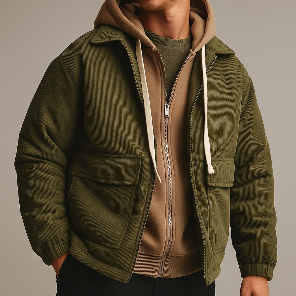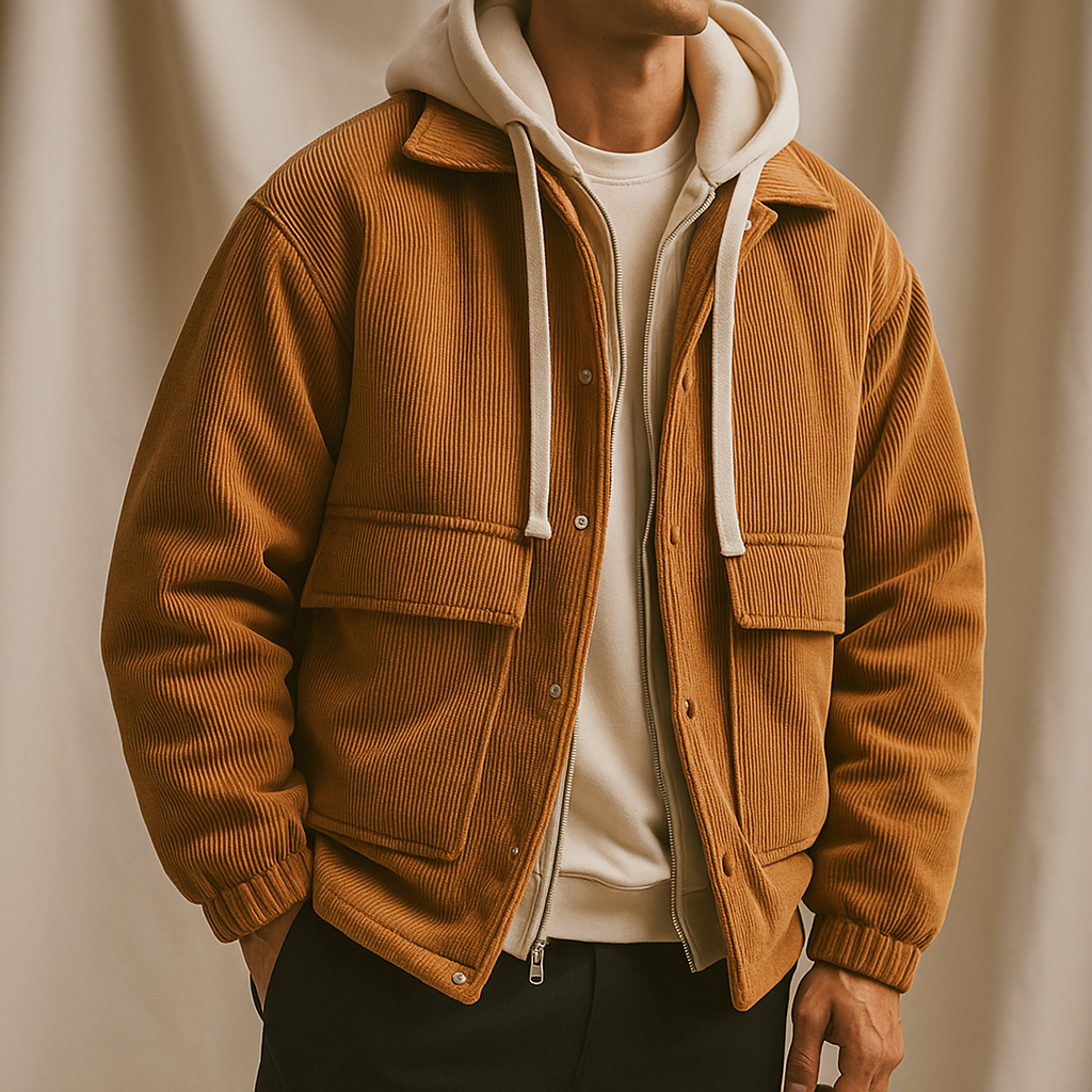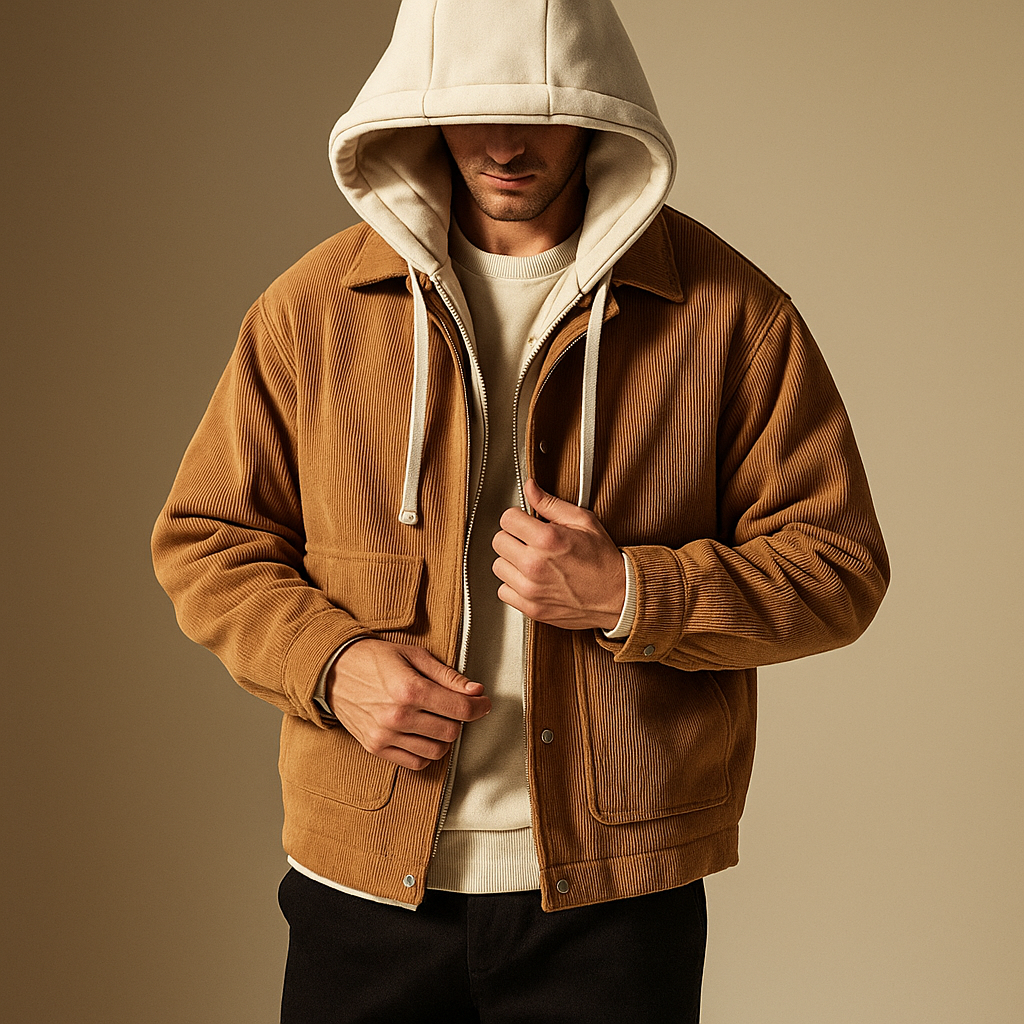Tailored from premium corduroy, this shacket balances refined structure with everyday resilience, complete with a hood and spacious pockets for modern utility. Designed for the man of quiet confidence who walks his own path, it’s a statement of strength that endures through every season.