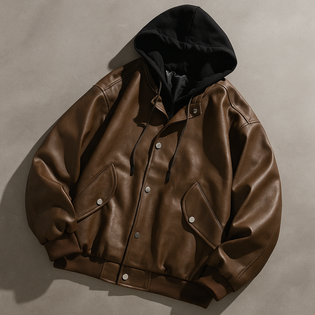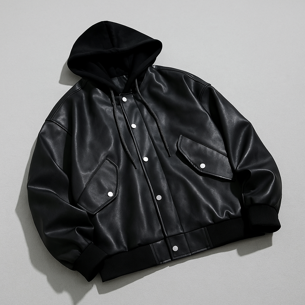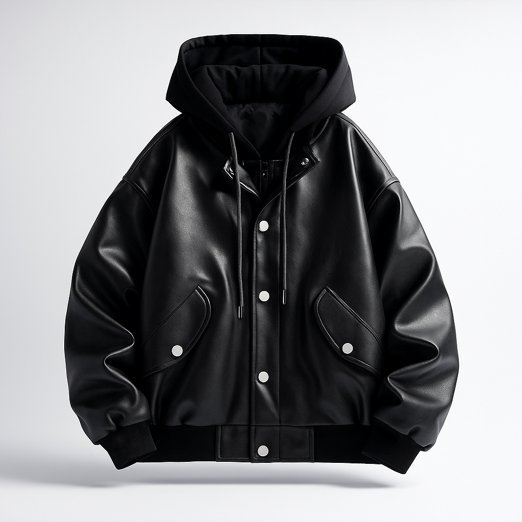 This statement leather-look jacket is fused with a sleek hooded design - a versatile outerwear essential built for the modern man. Complete with drawstrings, a stud-button placket, and both internal and external pockets, its tailored hem and cuffed sleeves ensure a structured fit that’s as warm as it is refined.